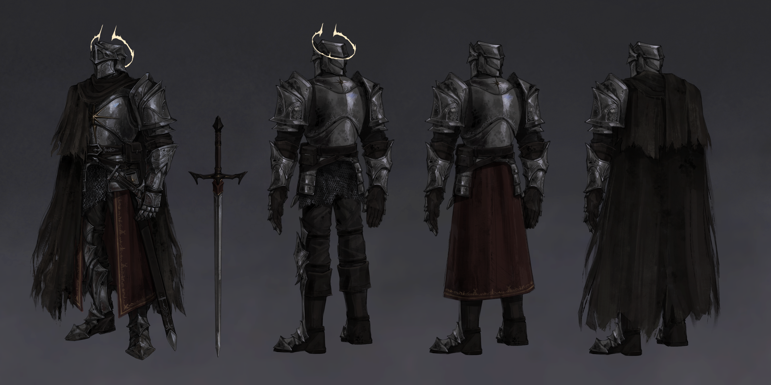✧ Elaborate but worn knight garb evokes both honor and the toil of duty